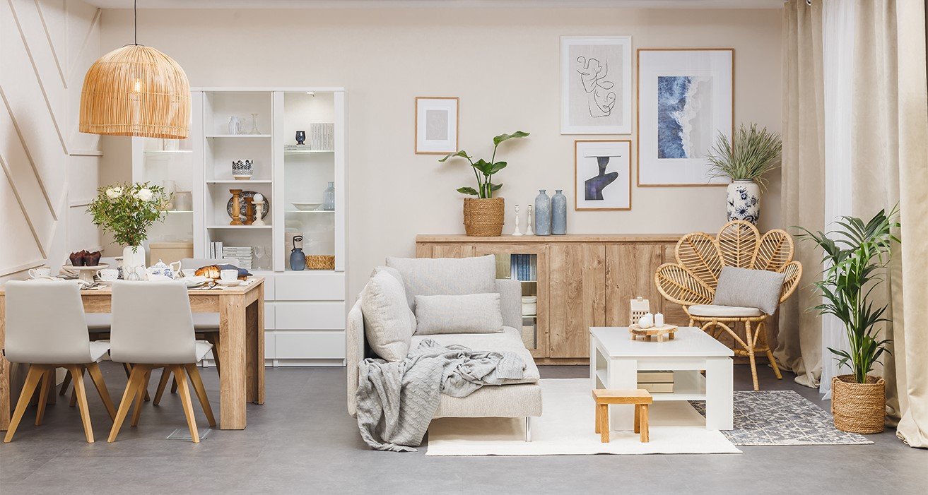 Aby ożywić wnętrze, a jednocześnie utrzymać w nim przytulną atmosferę, Karolina zagrała naturalnymi dodatkami. Mamy tu elementy skandynawskie, soft boho i hampton. Duży, zawieszony nad stołem bambusowy żyrandol, doskonale uzupełnia część jadalnianą. Wiklinowy, oryginalny fotel nadaje strefie relaksu charakteru, jednocześnie wyraźnie ją wyznaczając. Szara sofa, miękki jasny dywan czy beżowe zasłony, sprawiają, że przestrzeń stała się ciepła i zaprasza do spędzania w niej każdej wolnej chwili. Nie zabrakło też wyraźnych granatowych akcentów oraz zielonych roślin, które kontrastują z jasnymi, pastelowymi kolorami.