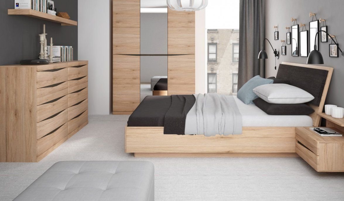 Jeżeli nie masz jeszcze wybranego stylu, w którym chcesz urządzić sypialnie, ale zależy Ci na ciemnych ścianach, najlepiej będzie postawić na kontrastujące pod względem kolorów meble. Szafa i komoda wykonana z jasnego materiału lub w kolorze naturalnego drewna będą jednocześnie wyglądać bardzo gustownie, a przy tym rozjaśnią pokój. Jasne meble z kolekcji Summer spiszą się tu idealnie, nadając sypialni lekkiego i delikatnego charakteru, a łóżko z wezgłowiem wykonanym z tkaniny (TYP 92) sprzyjać będzie odpoczynkowi. Świetnym wyborem będą także meble z frontami wykonanymi na wysoki połysk. Przestronna szafa, komoda czy też łóżko z podnoszonym stelażem z nowatorskiej Kolekcji Linate w kolorystyce łączącej biały połysk z dekorem Dąb Truflowy pięknie odbiją światło, przez co pomieszczenie wyda się bardziej rozświetlone i przestronne.