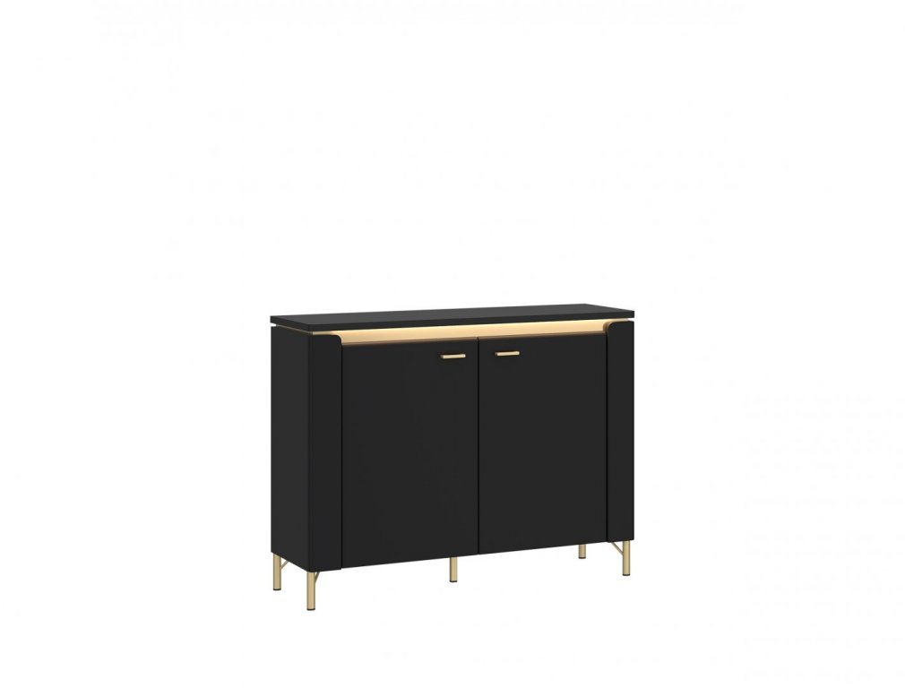 Die zweitürige Kommode Norica zeigt ein zeitloses, luxuriöses Zusammenspiel von mattem Schwarz und einem goldenen Farbton. Das Möbel wurde mit der integrierten LED-Beleuchtung TREND ausgestattet und zeichnet sich durch ein durchdachtes Design aus, bei dem das goldene Dekor perfekt mit den ebenfalls in Goldfarben ausgeführten Griffen und Metallfüßen harmoniert. Diese Kommode aus melaminharzbeschichteter Spanplatte und MDF überzeugt durch ihr großes Stauraumangebot im Bereich der Einlegeböden, die sich hinter den vollen Türfronten befinden. Das Möbel verfügt über Scharniere mit Dämpfung.