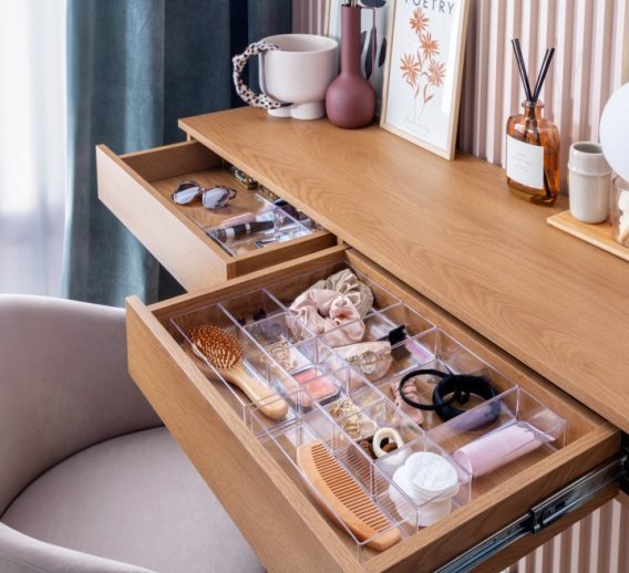 Biurko jest wykonane z płyty laminowanej wiórowej w odcieniu Dąb Karmel posiada dwie, pojemne szuflady, osadzone na kulkowych prowadnicach. Pełne wysuniecie szuflad zapewnia łatwy dostęp do ich zawartości, a starannie przemyślany, zachwycający design mebla niezwykły efekt wizualny, pozwalający kreować styl wystroju wnętrza. Biurko zachwyca minimalizmem dzięki bezuchwytowemu systemowi otwierania oraz prostocie nóżek.